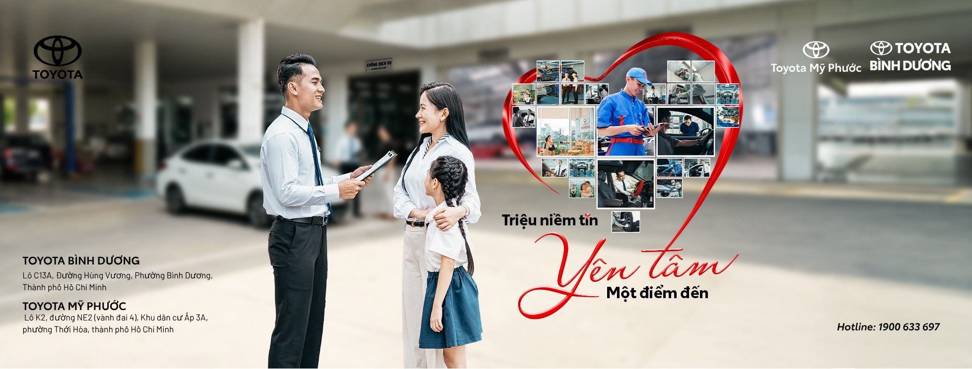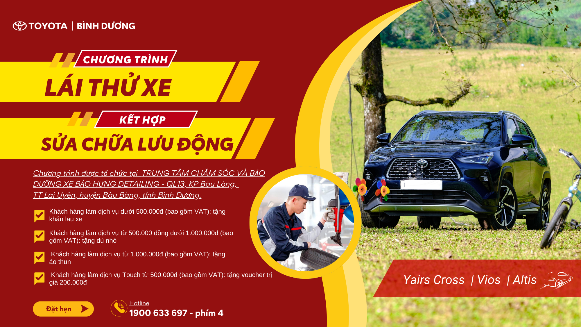 Toyota Bình Dương tổ chức chương trình sửa chữa lưu động trong các địa bàn thuộc khu vực Bình Dương như: Thủ Dầu Một, Bến Cát, Dầu Tiếng, Tân Uyên, Thuận An, Bàng Bàng, Bắc Tân Uyên,... ngoài giảm giá ưu đãi khách hàng còn có cơ hội tham gia bốc thăm trúng thưởng iphone 15pro và voucher trị giá 500.000đ